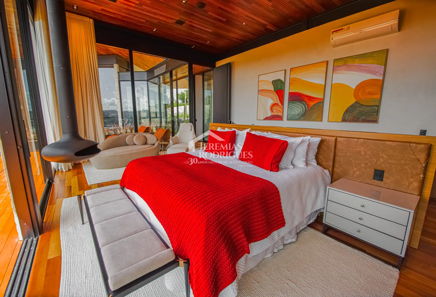 - 04 Suítes, sendo uma Master com telão e vista para a pedra do baú e cama explica e UNICA dos Irmãos Campana, mais 03 suítes sendo uma utilizada atualmente como escritório. Todas as suítes contam com banheiros equipados que aquecimento de piso, aquecedores de toalhas, mobiliários Vallve, e metais Hansgrohe. Os quartos possuem cama super king com pilou top em pluma de ganso e toda rouparia Trousseau personalizada, contam também com sistema de som e vídeo, aquecimento no piso e armários Kitchens.