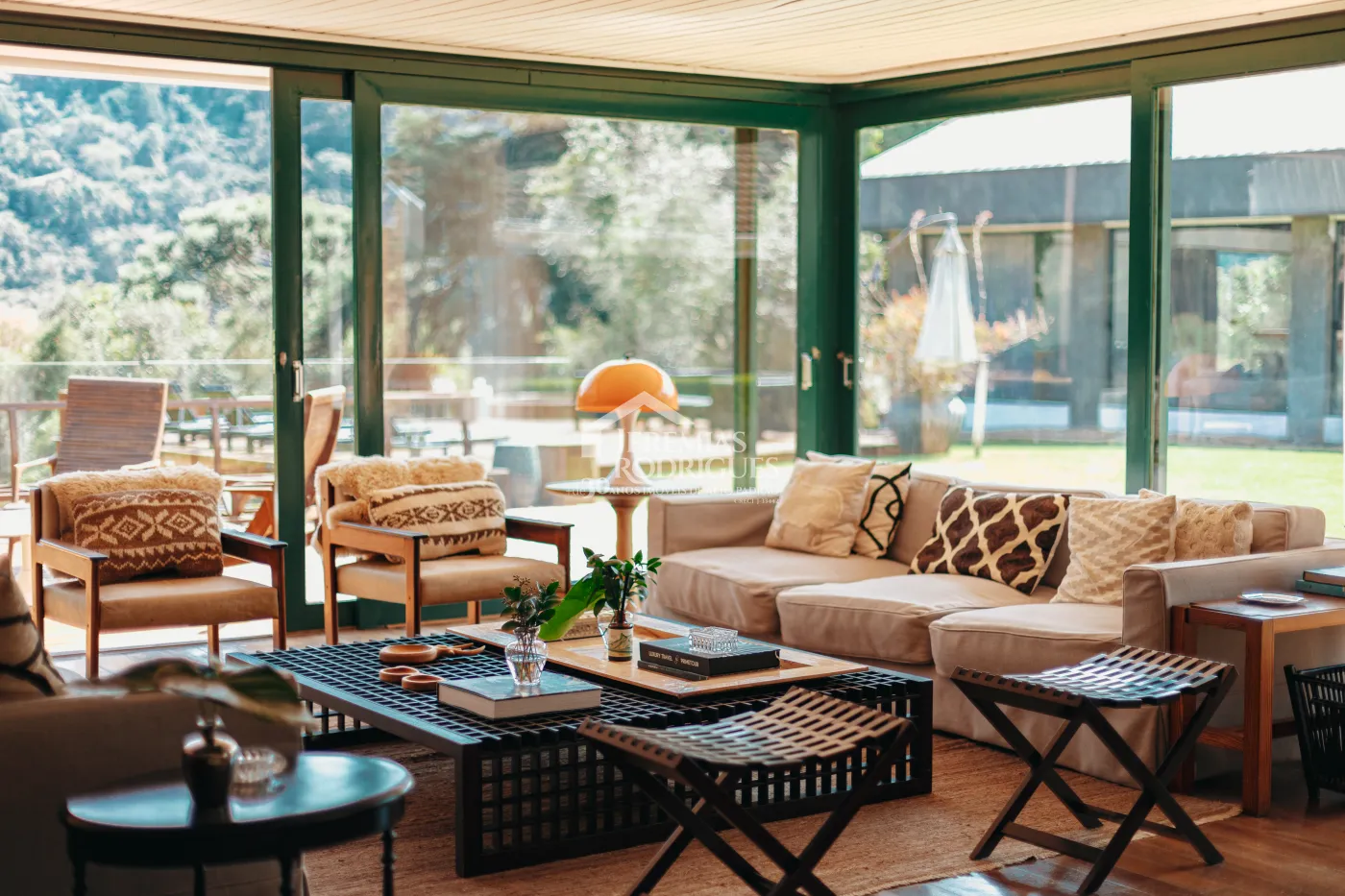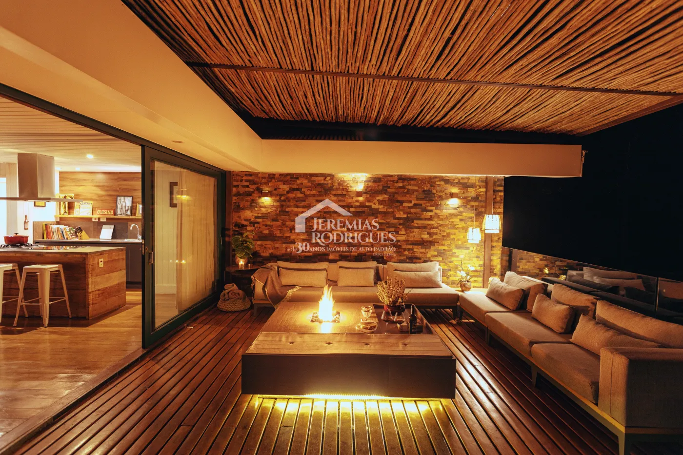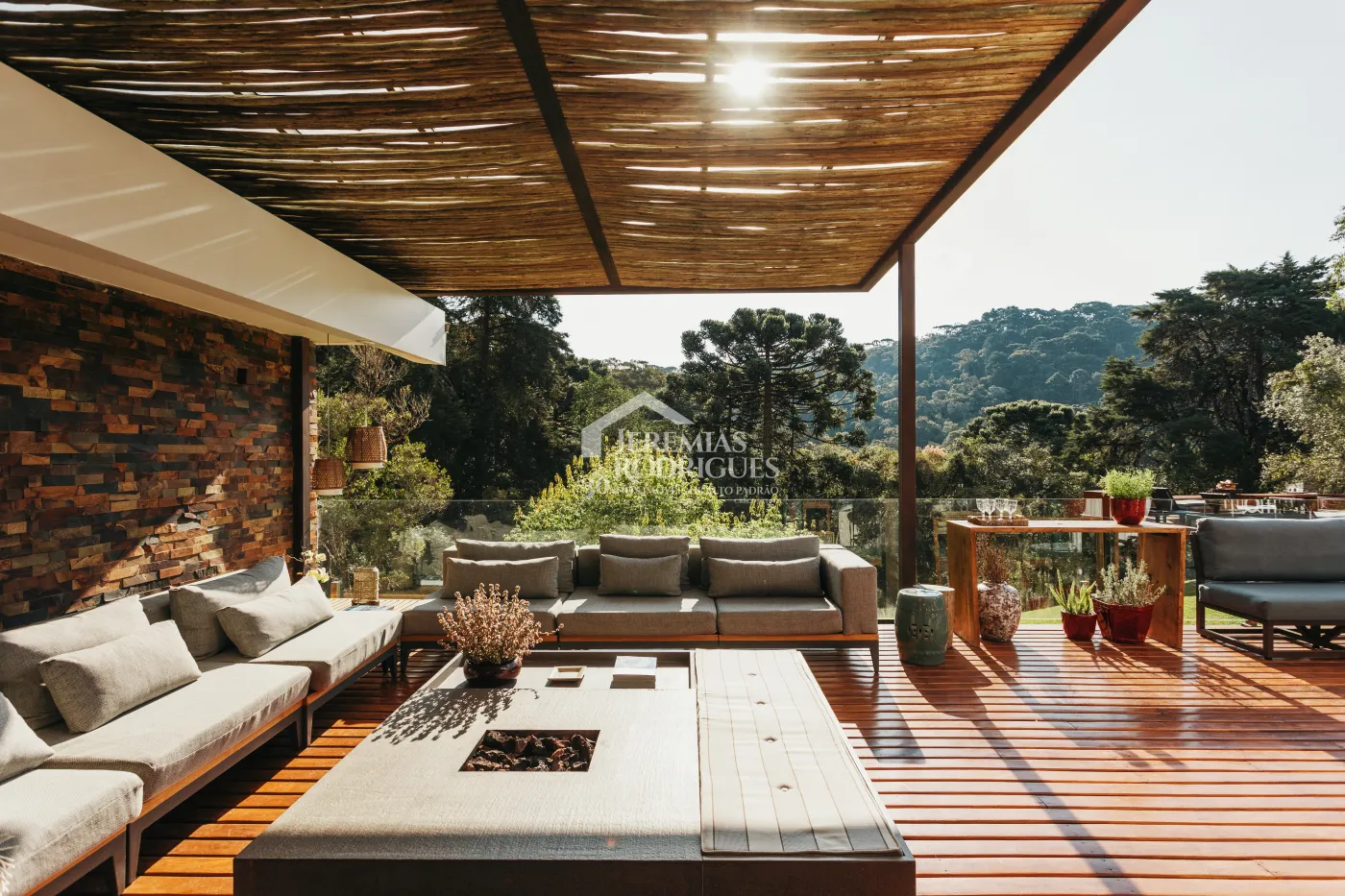 Lounge externo com pergolado e lareira